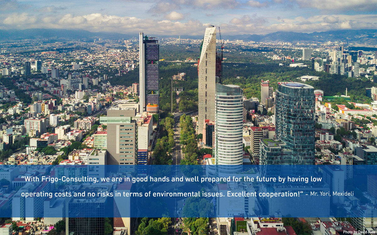 We are very delighted having been part of such an amazing and revolutionary project in Mexico, In the Mexican market, the use of the natural refrigerant CO2 is rare so far. Mexideli is taking a leading role and has now one of the first transcritical CO2-booster refrigeration system in operation. A major know-how transfer has taken place and the sophisticated technology of the CO2-refrigerations system works flawlessly. Mexideli, since 2014 part of the Emmi Group, is a leading importer of premium food products – including speciality cheese, in Mexico. The new food-processing- and logistic centre of Mexideli is situated east of Mexico City and has a refrigerated area of 7000 m2 with a total cooling capacity of 1.1 MW (medium temperature of 700 kW and low temperature of 400 kW).
